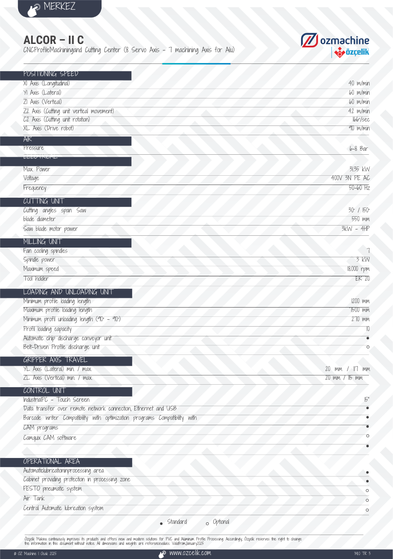 The servo 8-axis CNC profile profile machining and cutting center ALCOR – II C has been developed to carry out all-in-one cutting, milling, drain channel opening, punching and marking operations on profiles, and to perform special non-standard operations (punching, channel opening etc.) on different profiles. Thanks to its individually operating units, ALCOR – II C has been designed to offer maximum efficiency in less time.