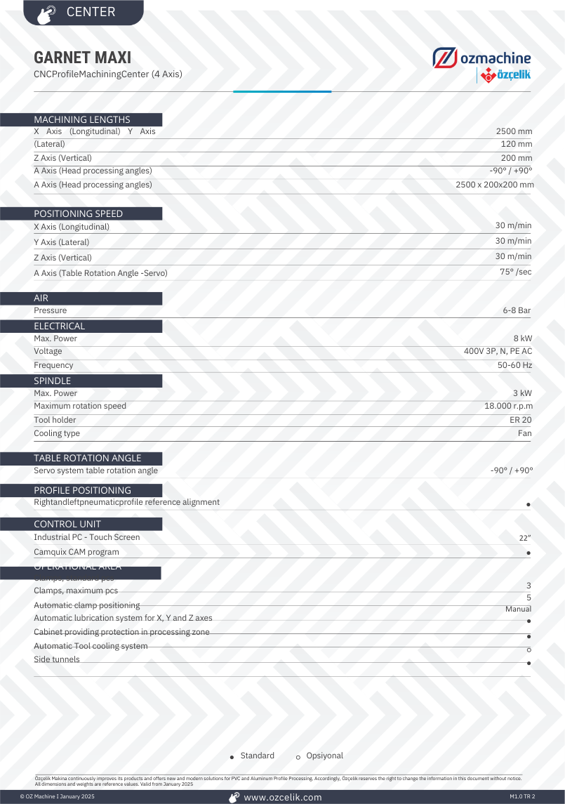The 4-axis CNC profile machining center, GARNET 8000, has the capacity to process aluminum profiles of various sizes, thanks to its spindle, which allows processing at any angle between -90 / +90 degrees providing solutions in a wide range of operations. The machine is developed to carry out all-in-one milling, drain channel opening, punching, marking and end milling operations on profiles, and to perform special non-standard operations on different profiles. The high processing capacity (580 mm x 290 mm) provides satisfactory user experience with the machines’ performance in all operations.