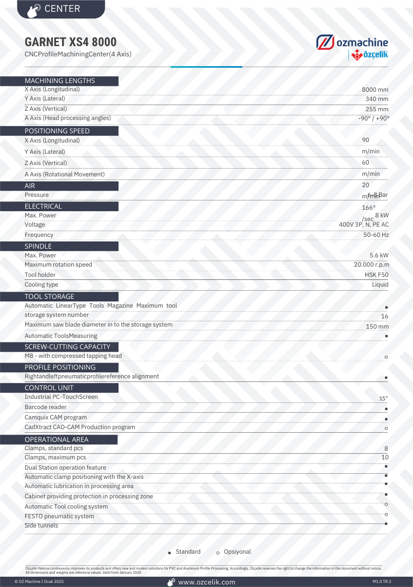 Thanks to its spindle which can operate in -90˚ / +90˚ fixed angles, the 4 axis CNC machining center, GARNET XS4 8000 can process different sizes of aluminum and PVC profiles and offer a wide spectrum of solutions to the user. The machine is developed to carry out all-in-one milling, drain channel opening, punching, marking and end milling operations on aluminum and PVC profiles, and to perform special non-standard operations on different profiles. The high processing capacity (340 mm x 255 mm) provides satisfactory user experience with the machines’ performance in all operations.