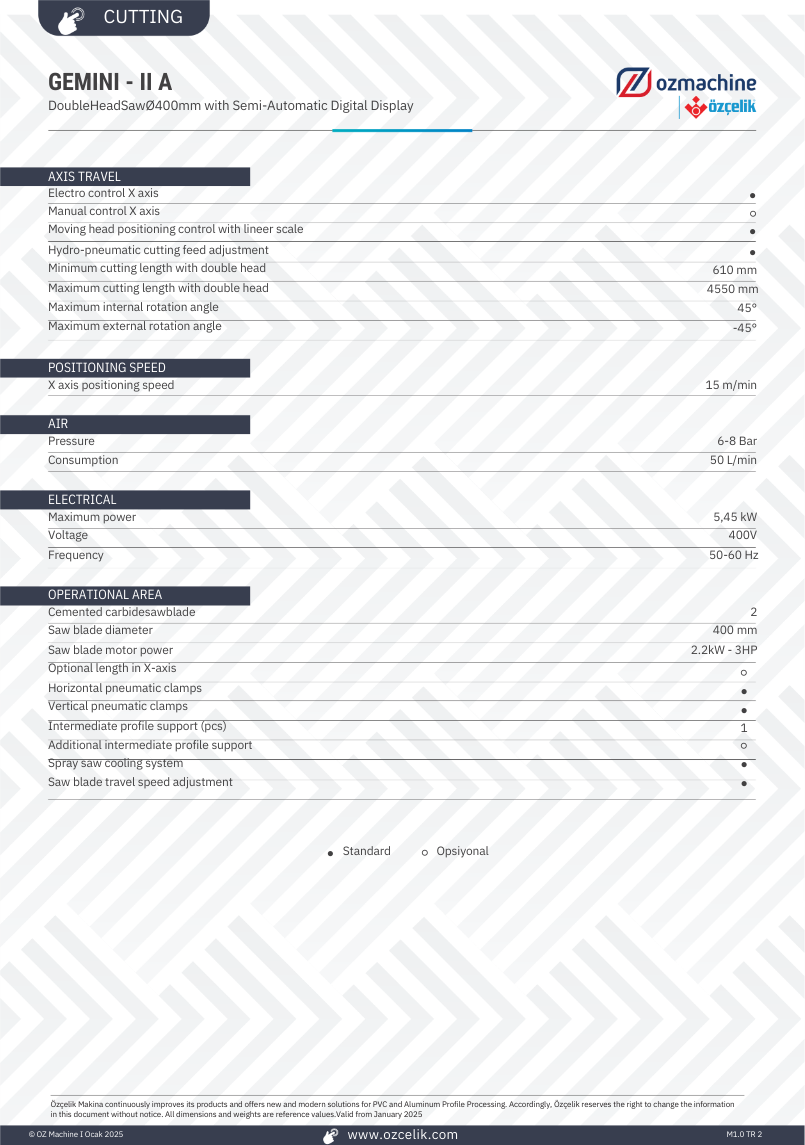 Semi-automatic double mitre saw with 400 mm saw blades GEMINI – II A is ideal for cutting aluminum, PVC and wood profiles in various angles and thickness. GEMINI – II A provides rapid and automatic positioning with electro control on X axis and moving head positioning control with linear scale. It is also provides manual positioning at any angles between -45° and +45°. Safety is a topmost priority for GEMINI -II A together with the horizontal and automatic clamps along with profile support unit which improve the cutting quality.