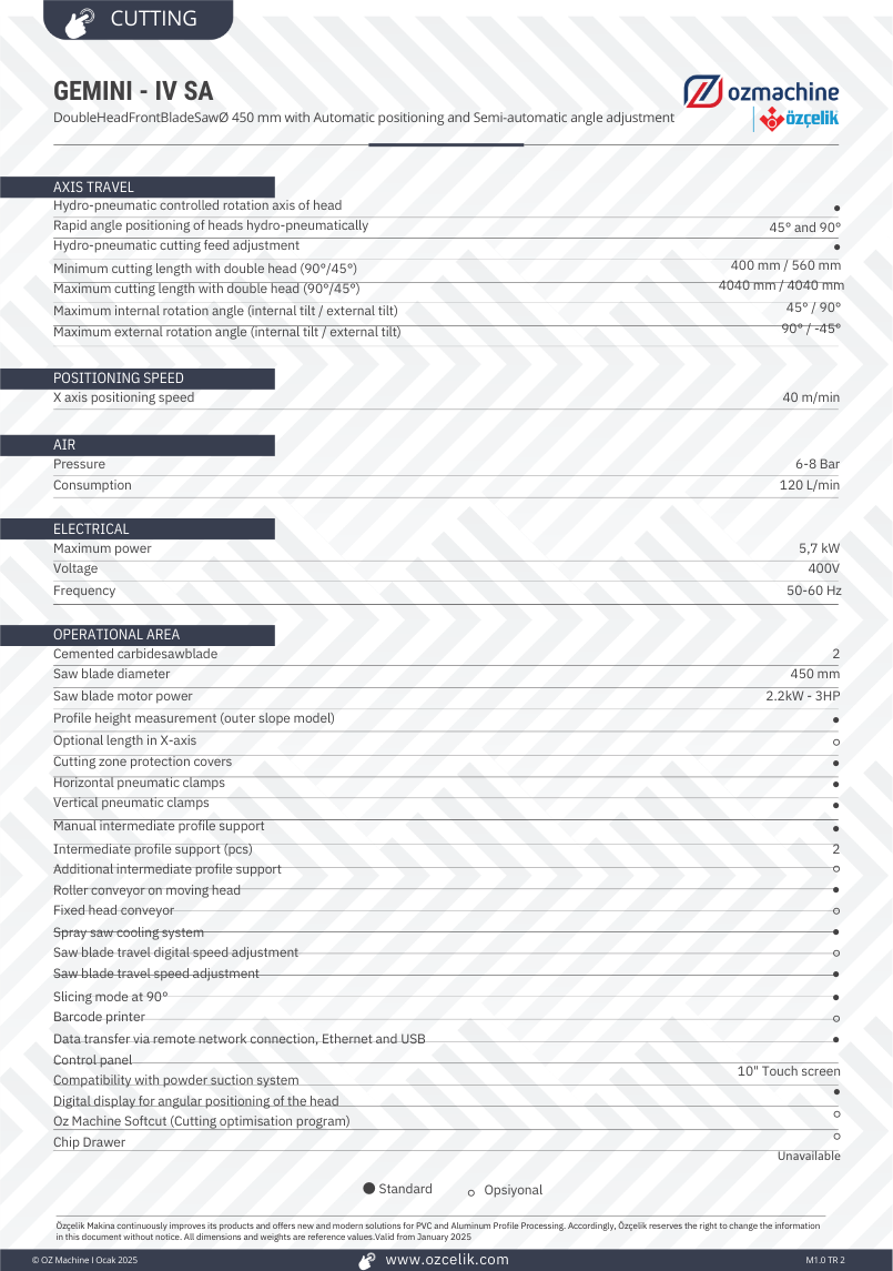 GEMINI – IV SA performs quick hydro-pneumatic angle positioning in 2 inclination models of -45°, 90° and 90°, 45° angles, while the heads that perform manual positioning in all other intermediate angles provide a perfect cutting process.