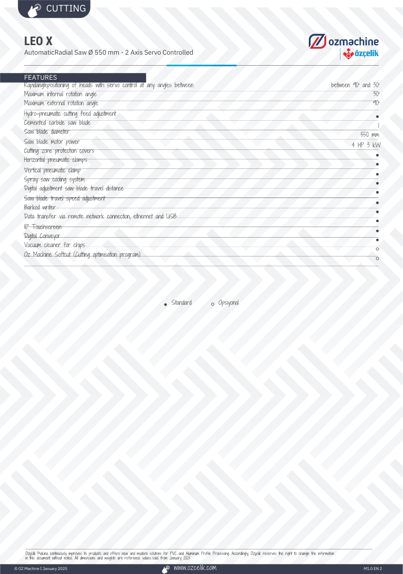 LEO-X, automatic Radial Saw with 2 axis servo controlled and 550 mm saw is ideal for cutting aluminum and PVC profiles with different angles and thickness. LEO-X designed for cutting wider profiles with the servo motion system, automatic positioning at all degrees between 90° and 30° allows for perfect cutting operation. Safety is a topmost priority for LEO-X together with the horizontal clamps and the vertical clamp along with profile protective shield which improve the cutting quality.