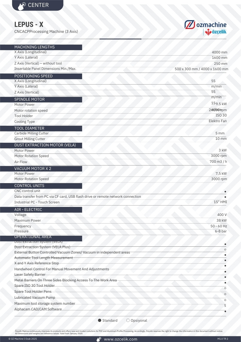 The LEPUS-X (3M) AND XL (4M) is a high-performance 3-axis CNC controlled panel processing machine designed for cutting, V-channel opening, and other precise operations on composite panels and plates. Equipped with an automatic tool magazine capable of holding up to 10 tools, the LEPUS-X minimizes setup time and streamlines workflow when switching between multiple machining operations.