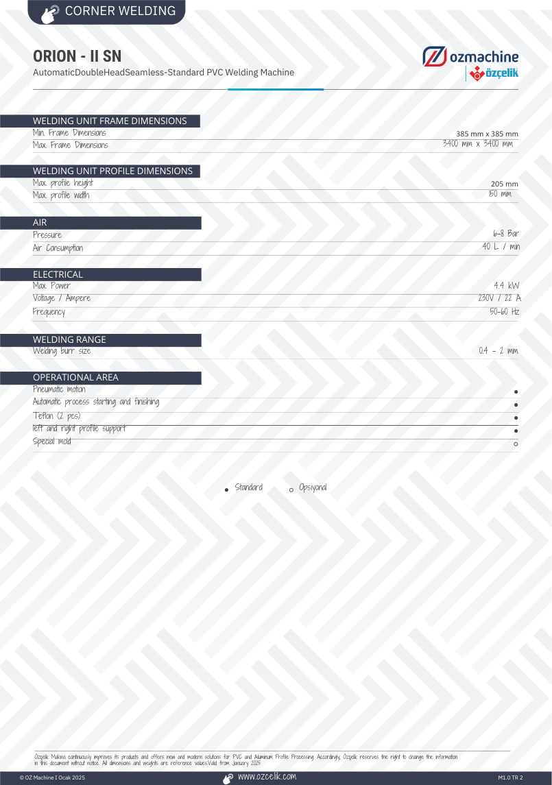 ORION – II SN which is automatic double head zero-normal uPVC welding machine, is used for welding processes in various perspectives of plastic profiles. It can weld between 60° and 180° in one head.